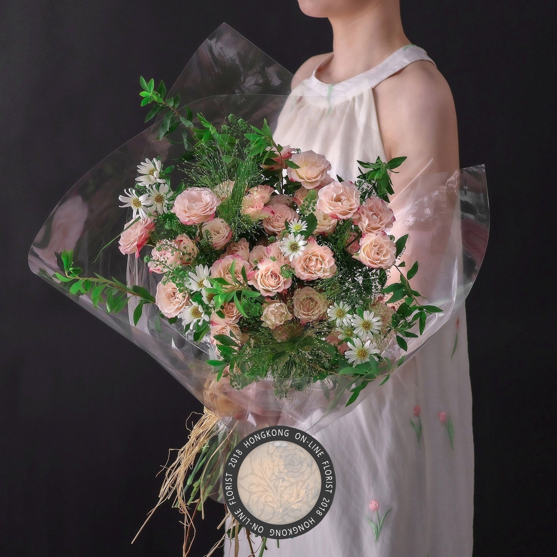 玫瑰噴泉草雪柳葉混搭新年花束香港鮮花即日配送