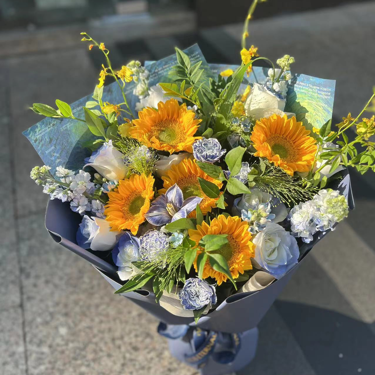 香港花店|Sunflower bouquet Graduation bouquet 5枝太陽花藍玫瑰鮮花 畢業鮮花